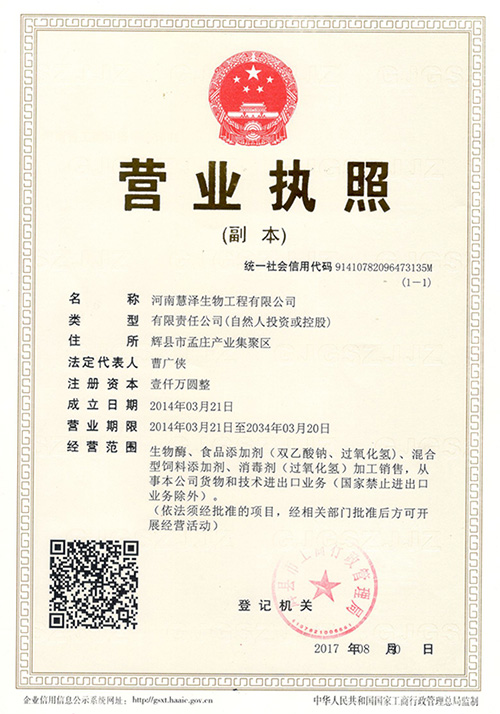 鄭州慧澤生化科技有限公司是一家充滿朝氣的科研生產(chǎn)型高技術(shù)企業(yè)。目前公司業(yè)務(wù)主要集中在精細化工、食品化工和微生物制劑行業(yè)。公司現(xiàn)已建成鄭州、焦作、新鄉(xiāng)三個生產(chǎn)基地,其中河南新鄉(xiāng)輝縣孟莊生產(chǎn)基地占地70畝,總投資達1.2億。現(xiàn)擁有年產(chǎn)100000噸過氧化氫消毒劑,年產(chǎn)8000噸的過氧化鈣和年產(chǎn)5000噸的雙乙酸鈉的生產(chǎn)線,同時開設(shè)有生產(chǎn)總量5000噸的枯草芽孢桿菌、地衣芽孢桿菌等微生態(tài)制劑發(fā)酵生產(chǎn)車間。公司始終堅持“以人為本,科技興企,品質(zhì)優(yōu)良,用戶滿意”的經(jīng)營宗旨。為客戶創(chuàng)造價值更多的價值...